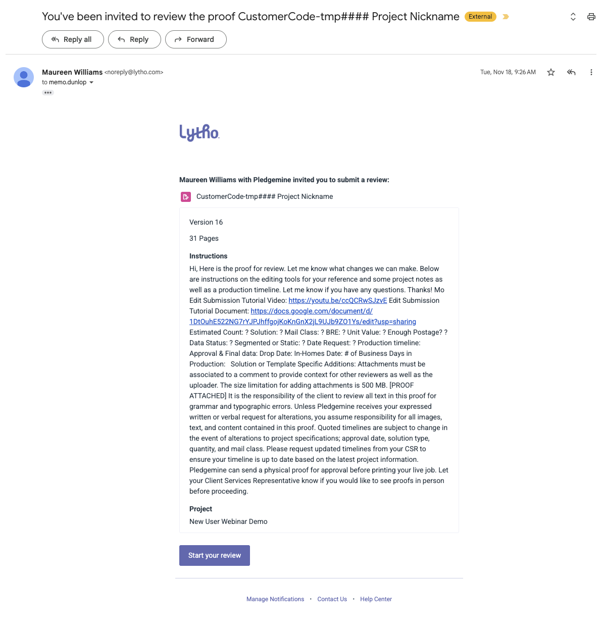 Once your Project Coordinator has finished setting up your project, you will receive a proof within 2 business days. You can view this proof via the link you will receive in a Lytho email. Make sure to add “noreply@lytho.com” to a safe senders list.