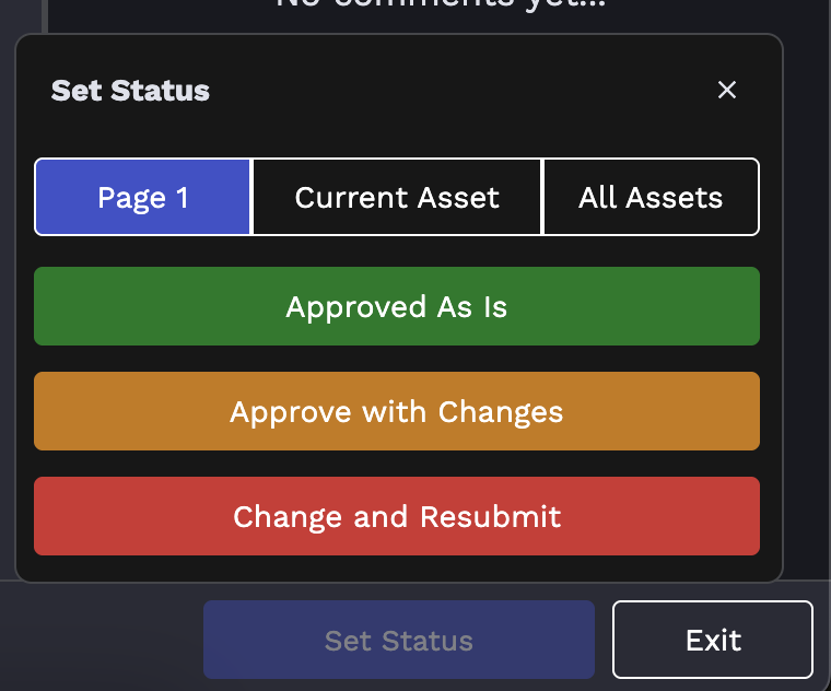 Once you have made your changes, you must select a status for each page of your proof. You'll notice that you have the option to select a status for the page you're currently viewing, the asset you're currently viewing or all assets in a proof. Below is a description of the options you have to select from.