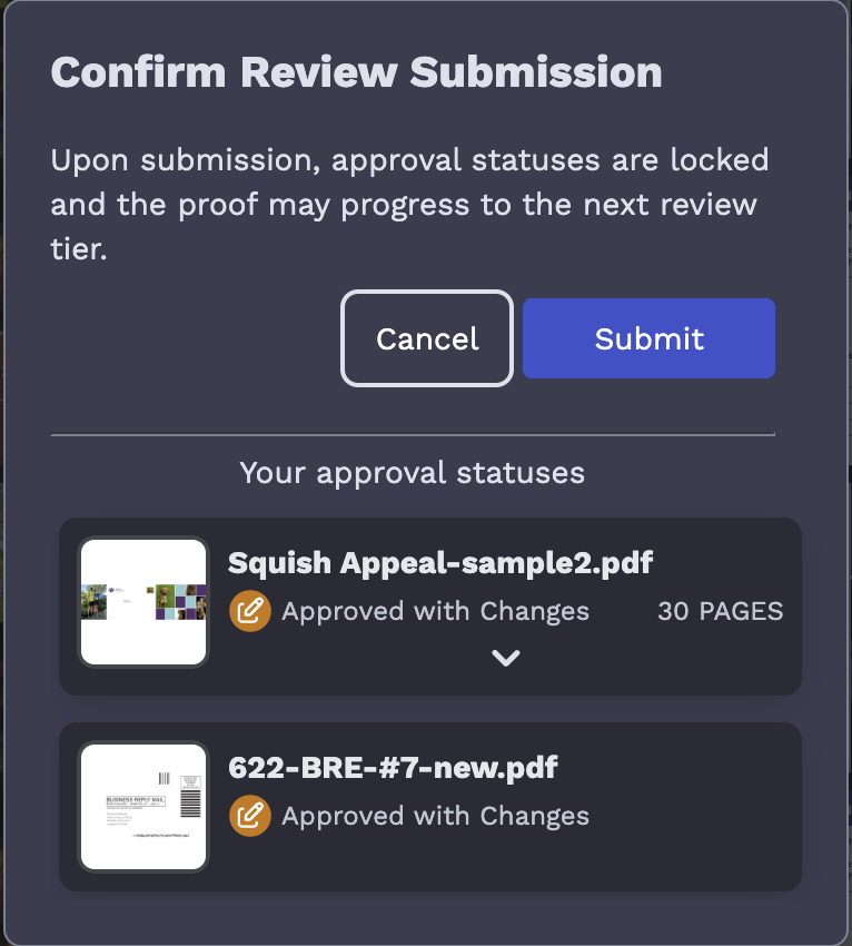When you hit that button a pop-up will appear allowing you to have one final review of the status selections you've made. Hitting submit here is the final step to return a proof back to Pledgemine.