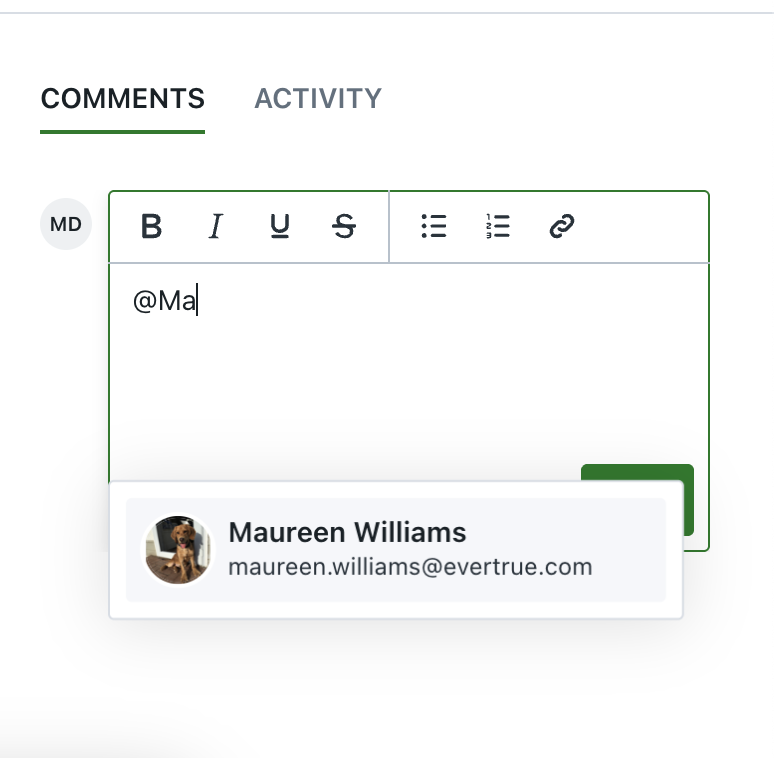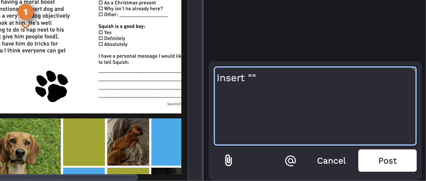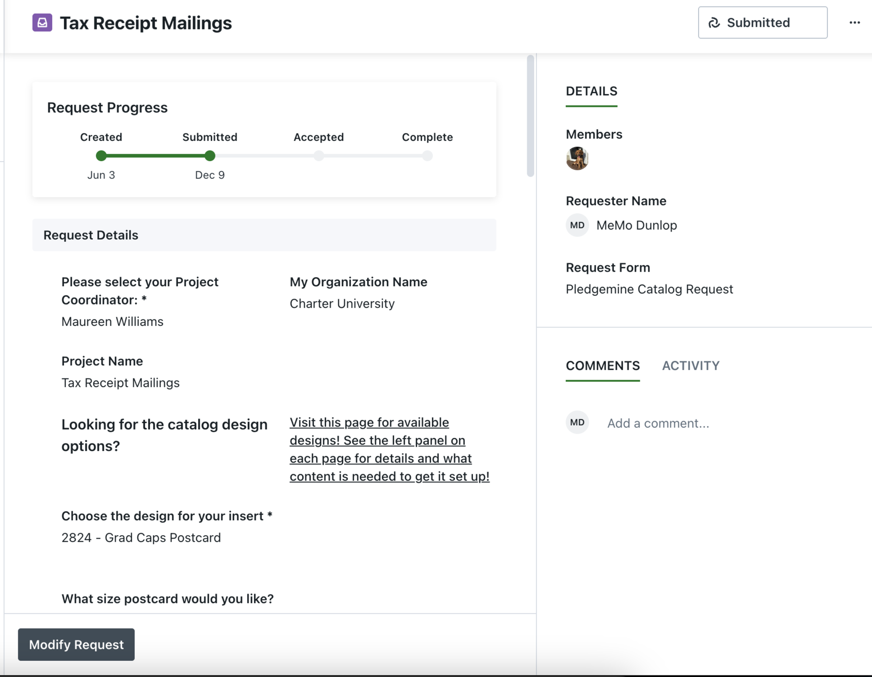 - If there is any additional important information after your Project Coordinator has received your request, but before a first proof has been sent to you, you can @mention your Project Coordinator (by typing ‘@’ and then begin typing your Project Coordinator's name) in the comment section in the left sidebar of the Project Request Form.